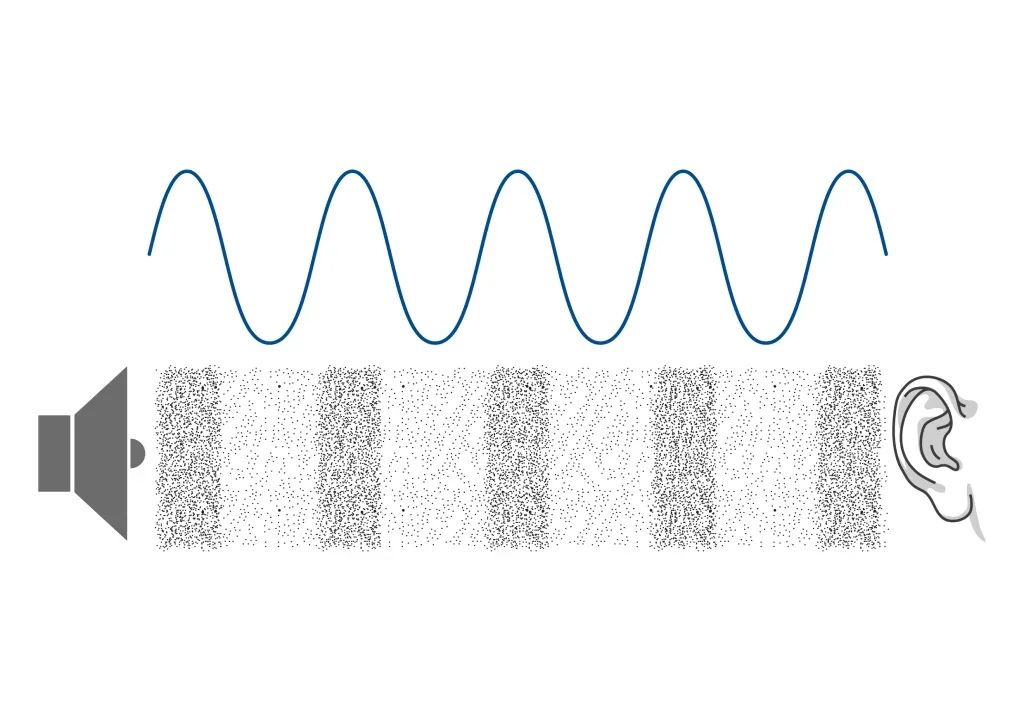 Все починається з джерела вібрації. Коли динамік у колонці рухається вперед, він стискає повітряні молекули, створюючи зону високого тиску – компресію. Коли рухається назад, молекули розріджуються, утворюючи зону низького тиску – розрідження. Ці зони поширюються як ланцюгова реакція, формуючи поздовжню хвилю. На відміну від поперечних хвиль, як брижі на воді, де частинки рухаються перпендикулярно до напрямку хвилі, звукові хвилі – поздовжні: молекули "штовхаються" паралельно шляху поширення.